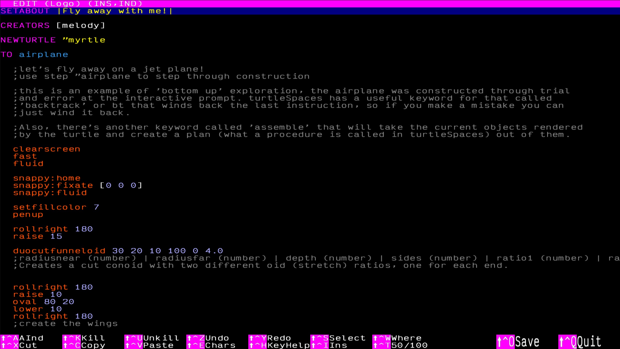 Retro-styled text editor features syntax highlighting, auto-indenting, cut / paster, search and undo / redo. But you can also use whatever editor you wish, and then simply drag and drop your .lgo file on to the turtleSpaces window!
