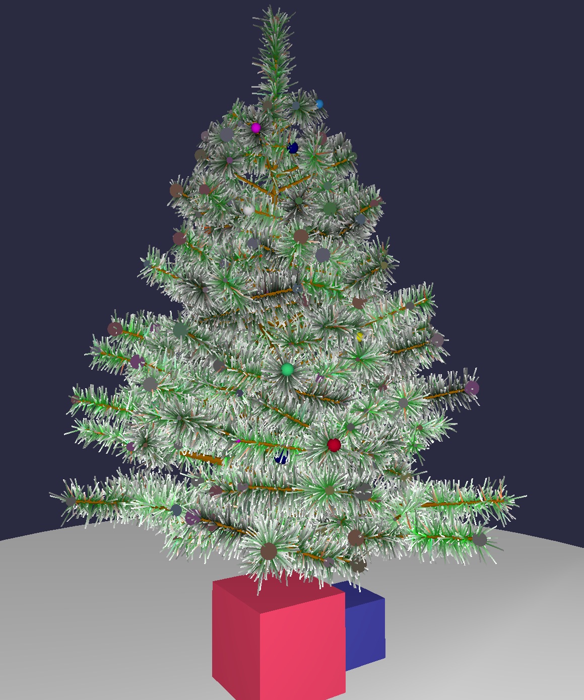 Screenshot of xmastree, another example. Demonstrates lighting and gradient lines and the extremes to which one can go with lines. Also the use of multiple turtles to 'light' the tree