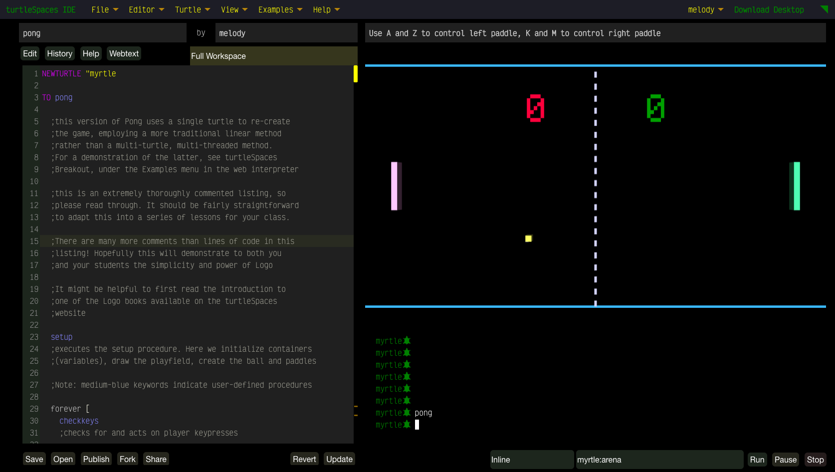 So, in this example, while the turtle acts as the ball, it also draws the paddles and the scoreboard as needed, and some tricks are used to smooth this over, the way you would in other single-threaded programming environments. Meanwhile, it also demonstrates the directional capabilities of the turtle, and how it operates in the turtleSpaces environment from its own perspective.