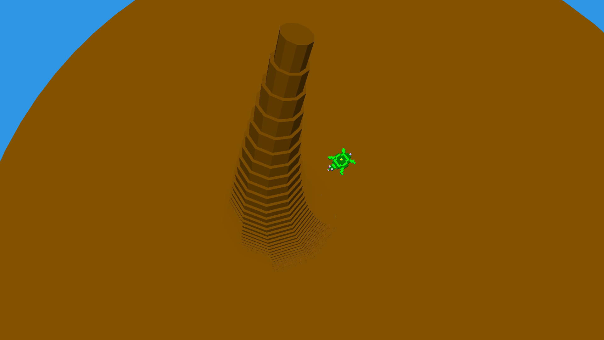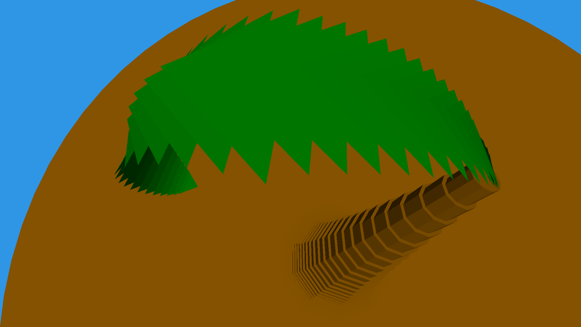 First we begin with a tree. We can build a trunk using a repeat loop of cylinders that get narrower in diameter and longer as we go. We can introduce a slight curve as well by tilting the turtle up a bit each cylinder we create: