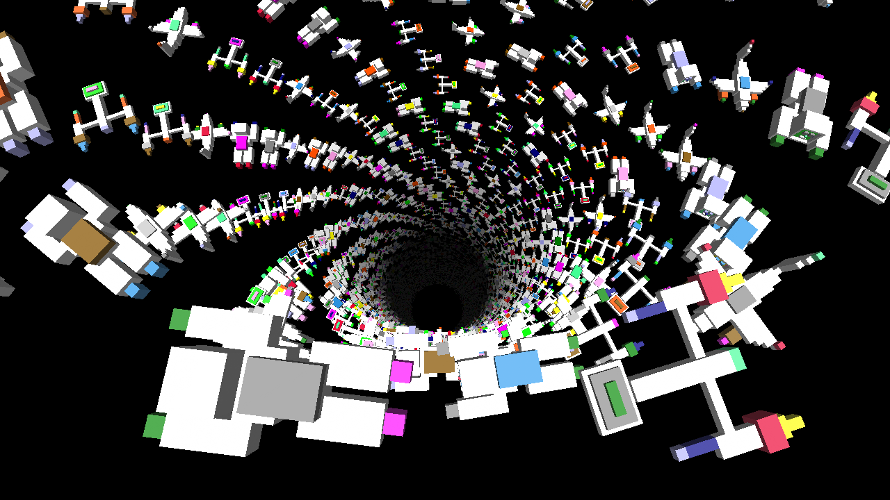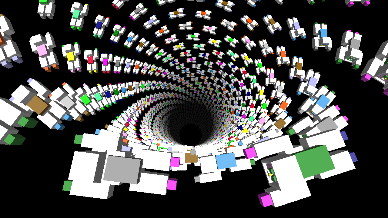 In turtleSpaces, you can ‘stamp’ the current model, leaving a copy of it in the current position. This can be useful in some circumstances, to create artworks made out of more sophisticated models. In the case of this example, we’re going to use the default ‘myrtle’ turtle model to create a descending spiral of turtles.