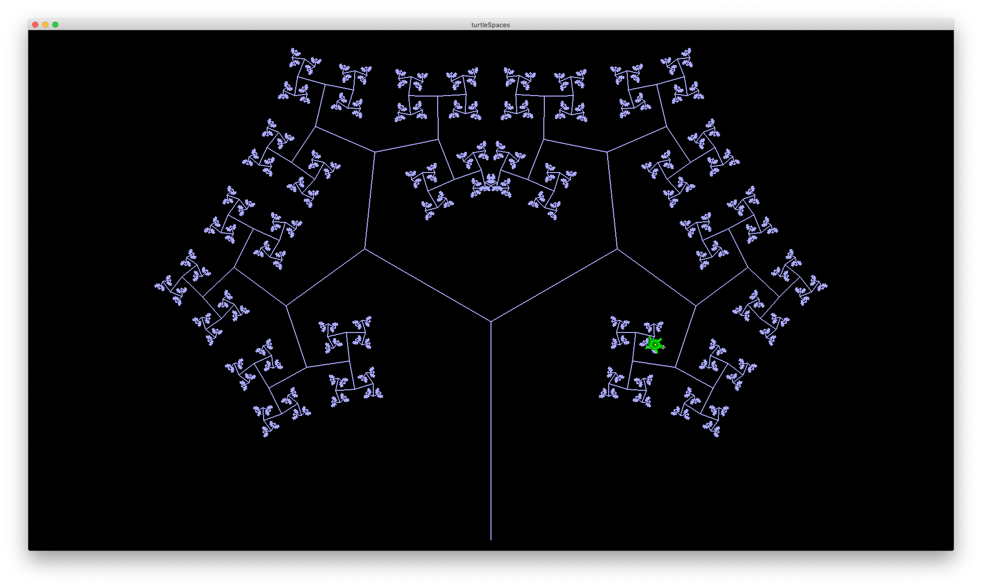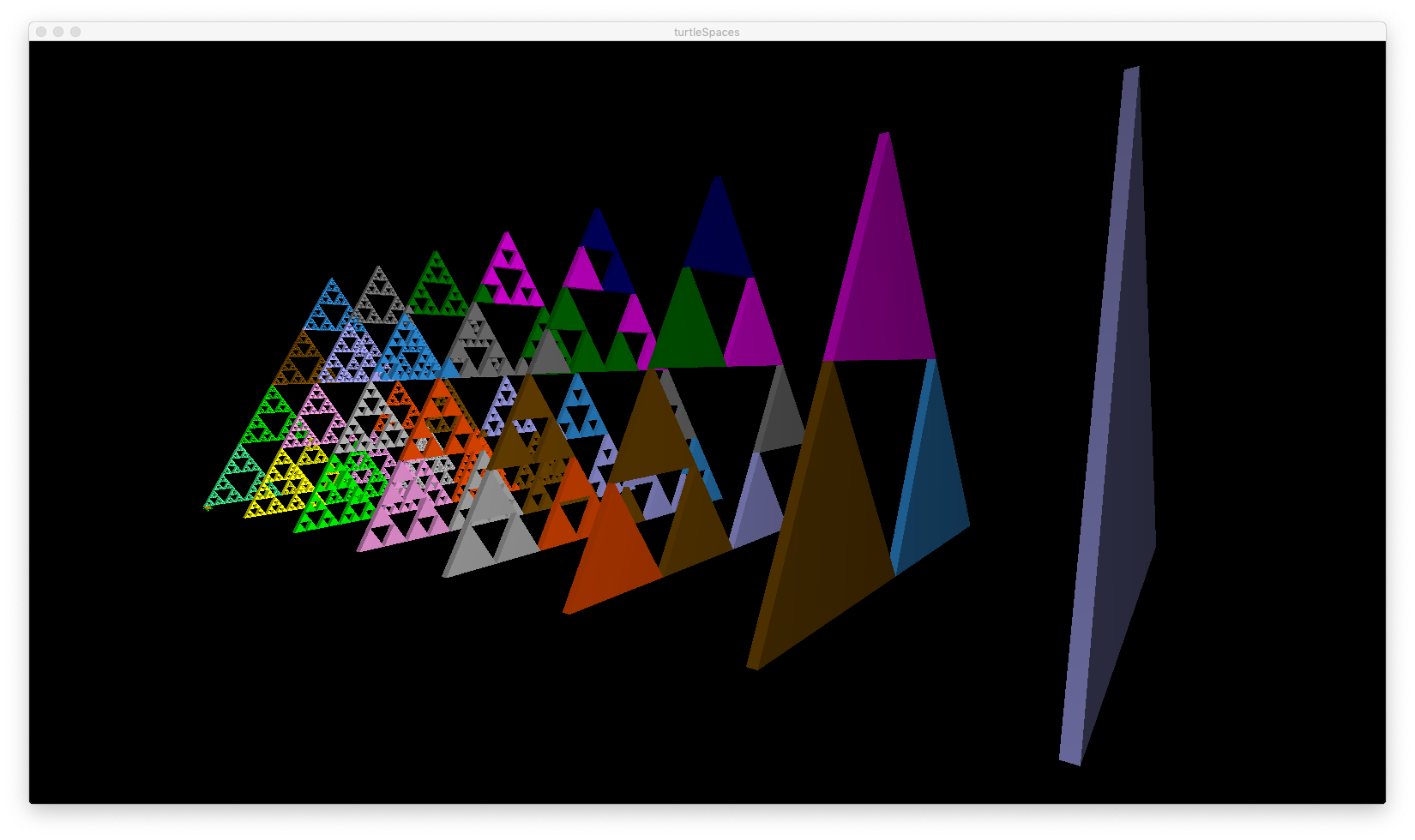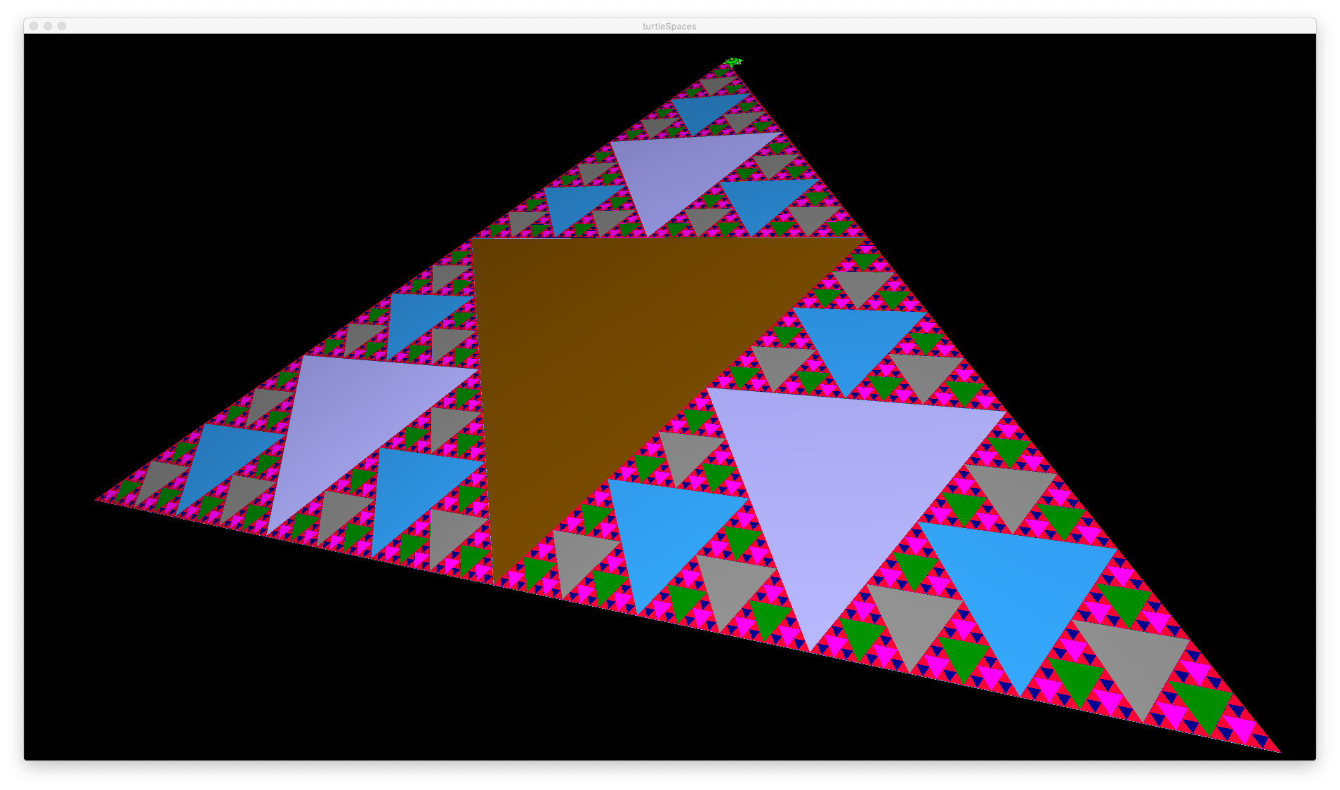 These routines use recursion (they repeatedly call themselves) to realise different Sierpinski algorithms. Logo’s recursion capabilities and relational turtle make it excellent for the task of rendering these algorithms! They’re also very pretty.