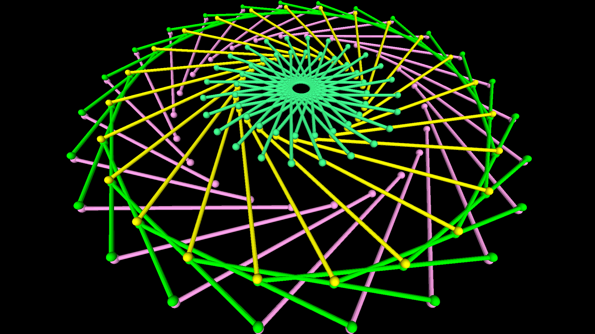 Each side of the almost-square is coloured based on its iteration in the almost-square loop, and the fill colour of the balls is set to match. Also, each iteration is raised an amount relative to its iteration, creating a pleasing 3D effect.