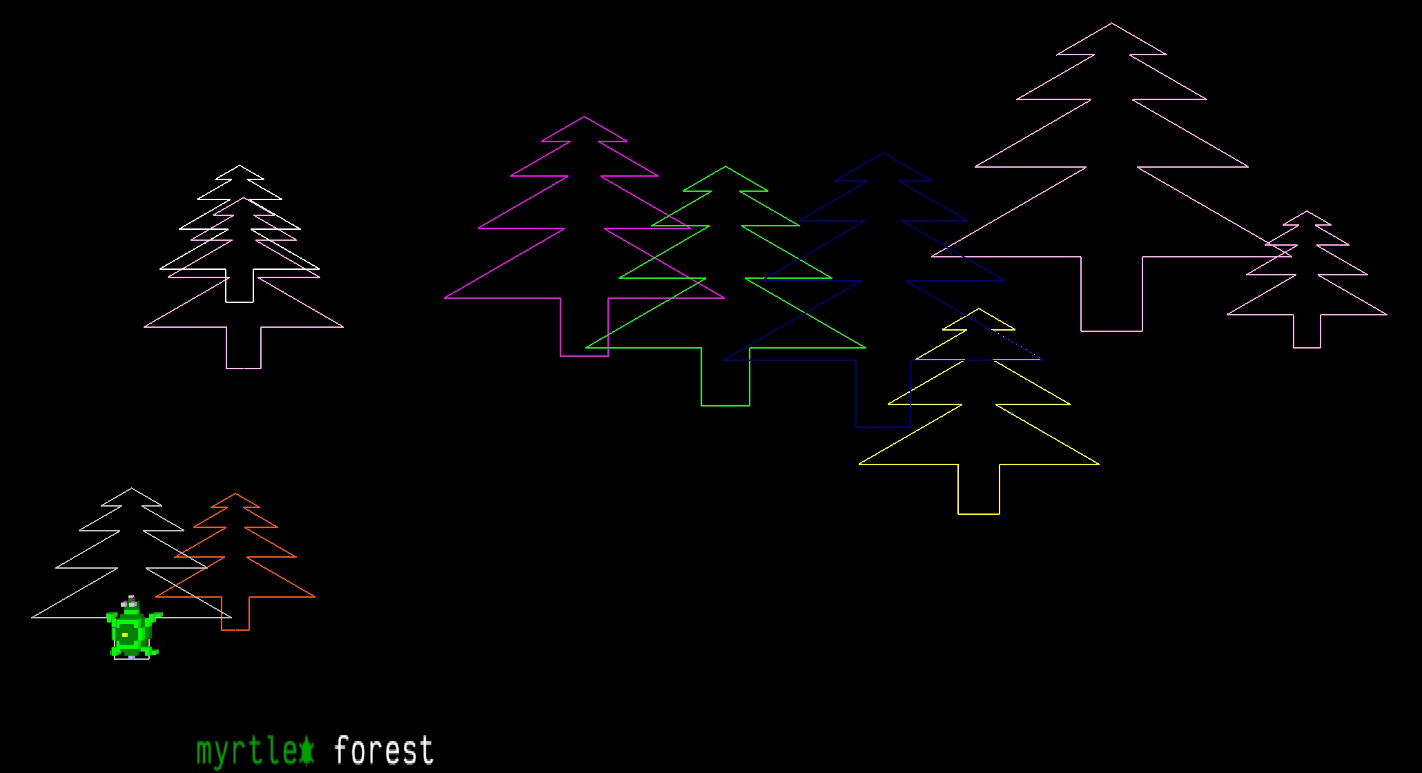 These procedures draw a simple tree in a classic Logo lined style, and a forest of these trees. First, let’s take a look at the tree procedure as a whole.