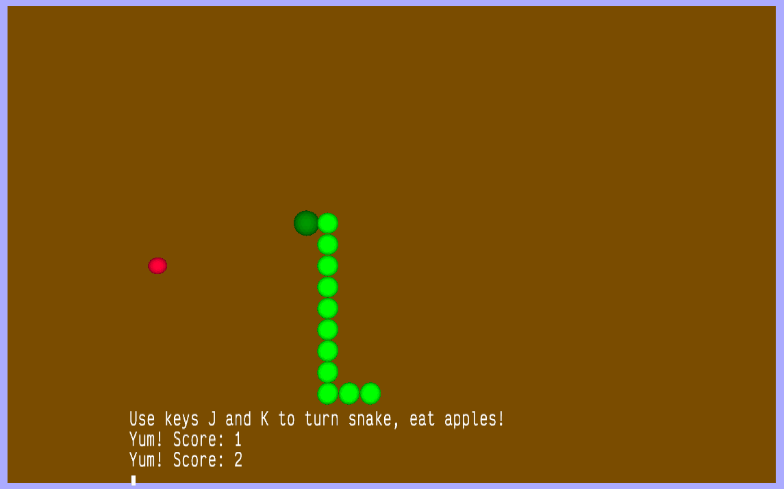 print |Use keys J and K to turn snake, eat apples!|
