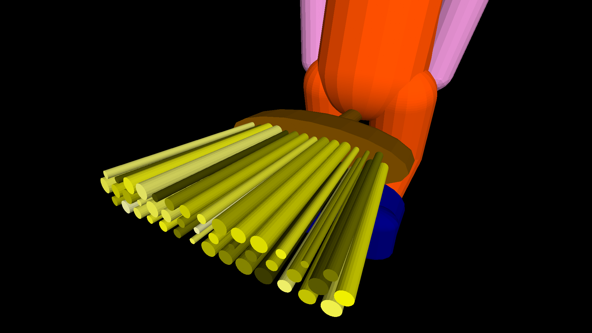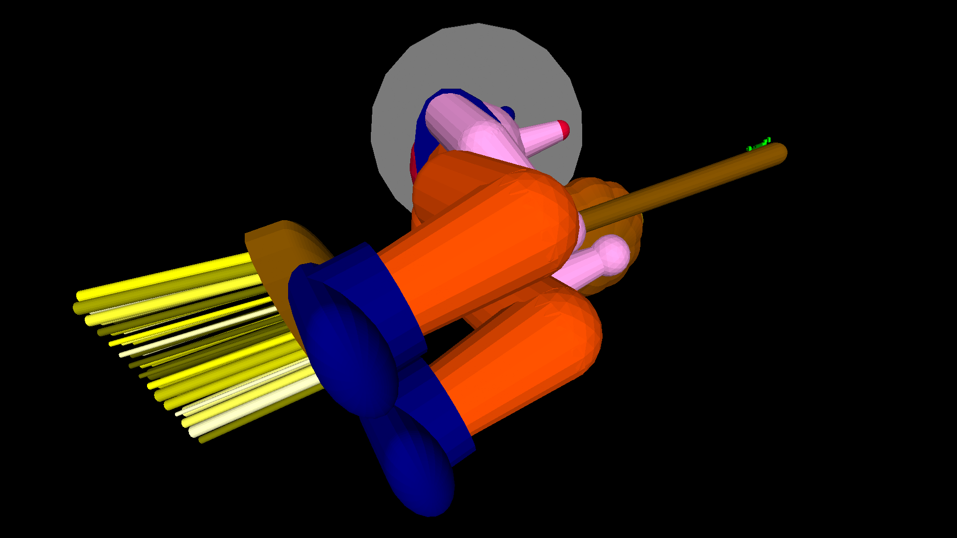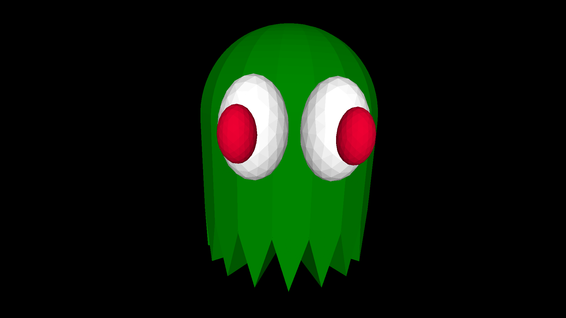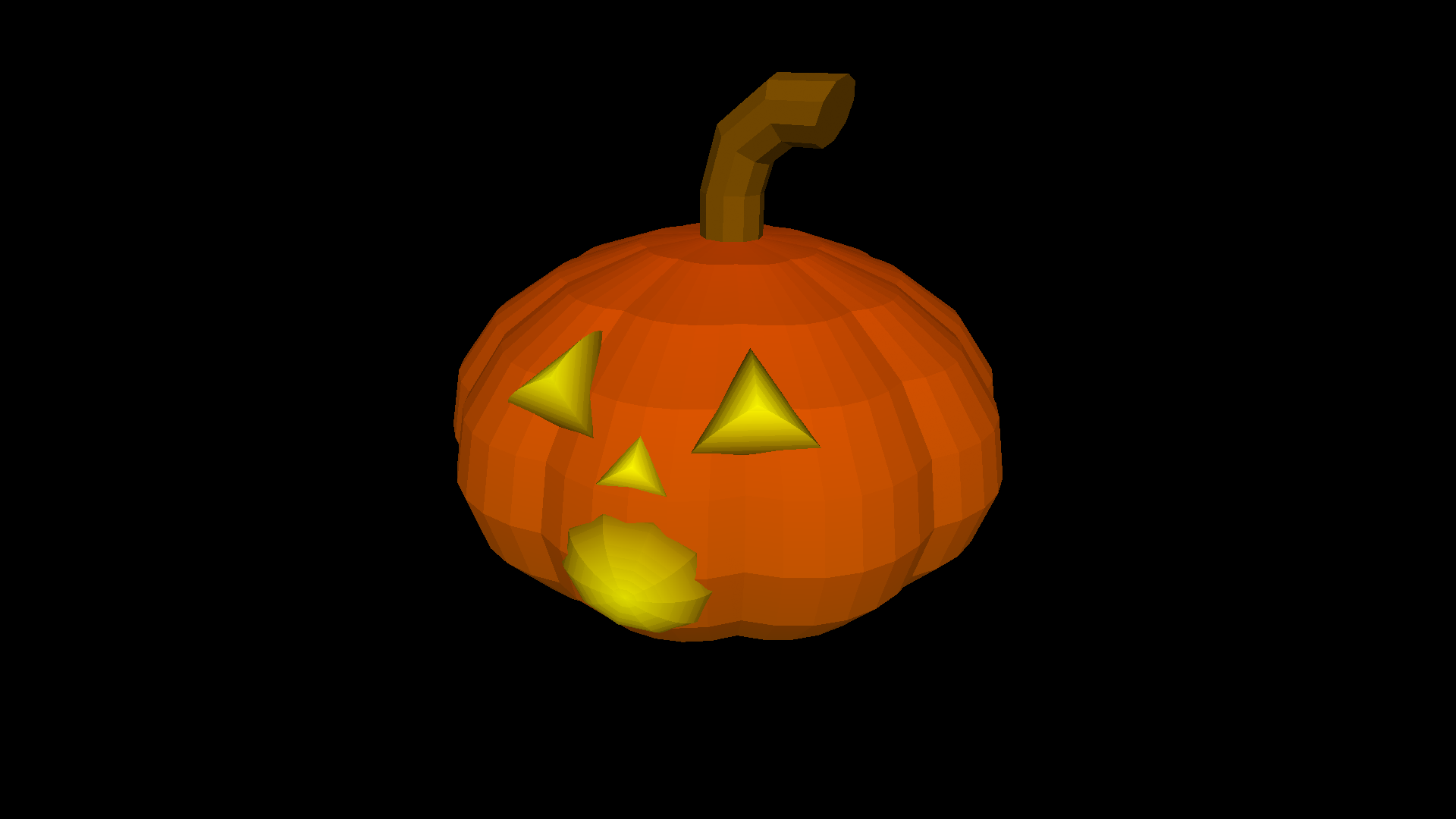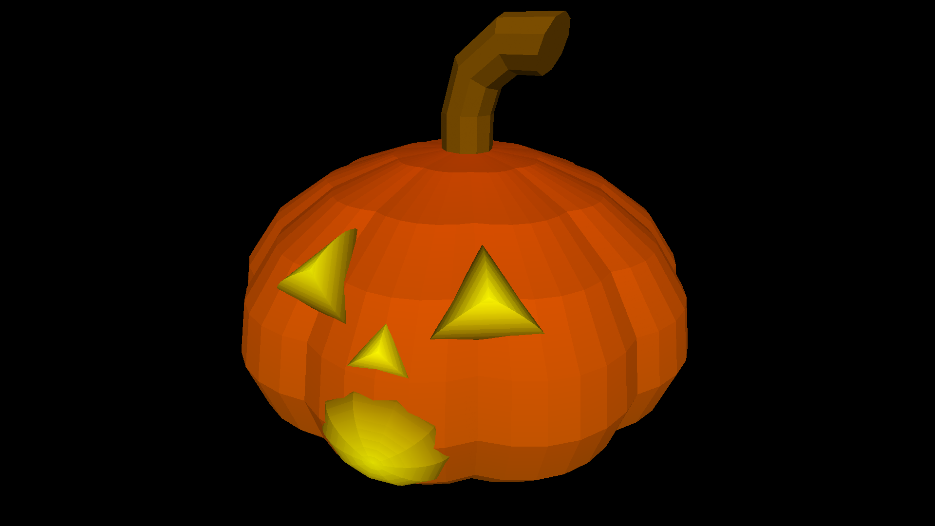 The pumpkin is created using the spheroidslice primitive, which creates an elongated slice of a sphere. By creating ten of these slices (every 36 degrees) we can easily create the pumpkin’s body:
